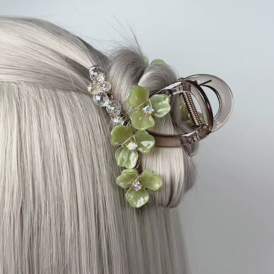 The fabric bloom sits gently against the acrylic base, and the little rhinestone detail gives it a quiet sparkle. It’s not loud or showy—just easy, pretty, and peaceful. The kind of thing you wear without fuss, but it still feels like a little treat.