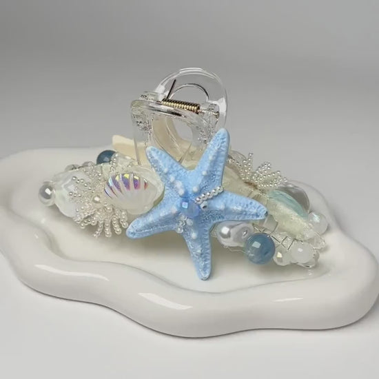 Each side of the clip is a little different. One has a soft blue starfish and cool-toned pearls, while the other side has a cream starfish and a mix of beads and shimmer, like scattered beach treasures. The details are placed by hand—no two clips are ever exactly alike.