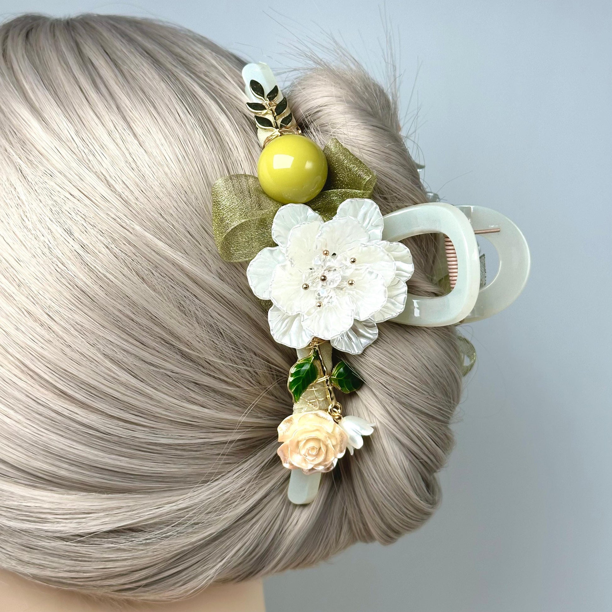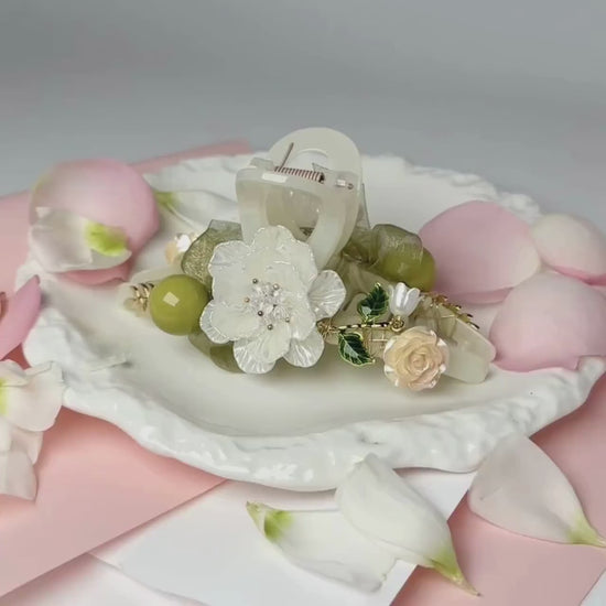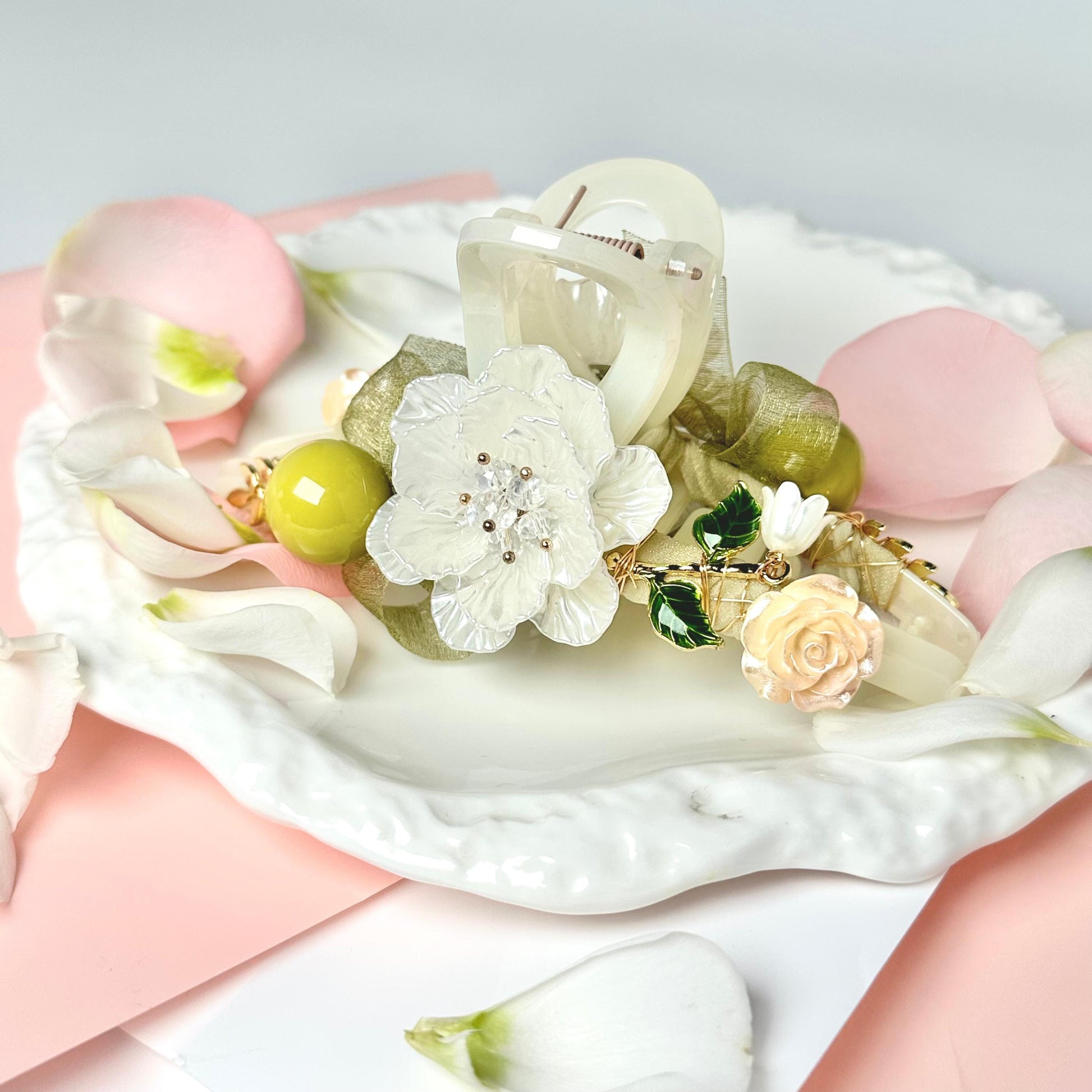 Hello! I'm Pepper. Thank you so much for visiting my little handmade shop! I designed this piece around a luminous gardenia to evoke the elegance and serenity of a spring morning. The soft ivory tones are paired with golden accents, delicate ribbon, and floral charms to create a harmonious, dreamy composition. Inspired by the timeless beauty of blooming gardenias, my hope is that this clip brings a sense of calm and quiet grace to your look—like holding a little piece of nature’s poetry in your hair.
