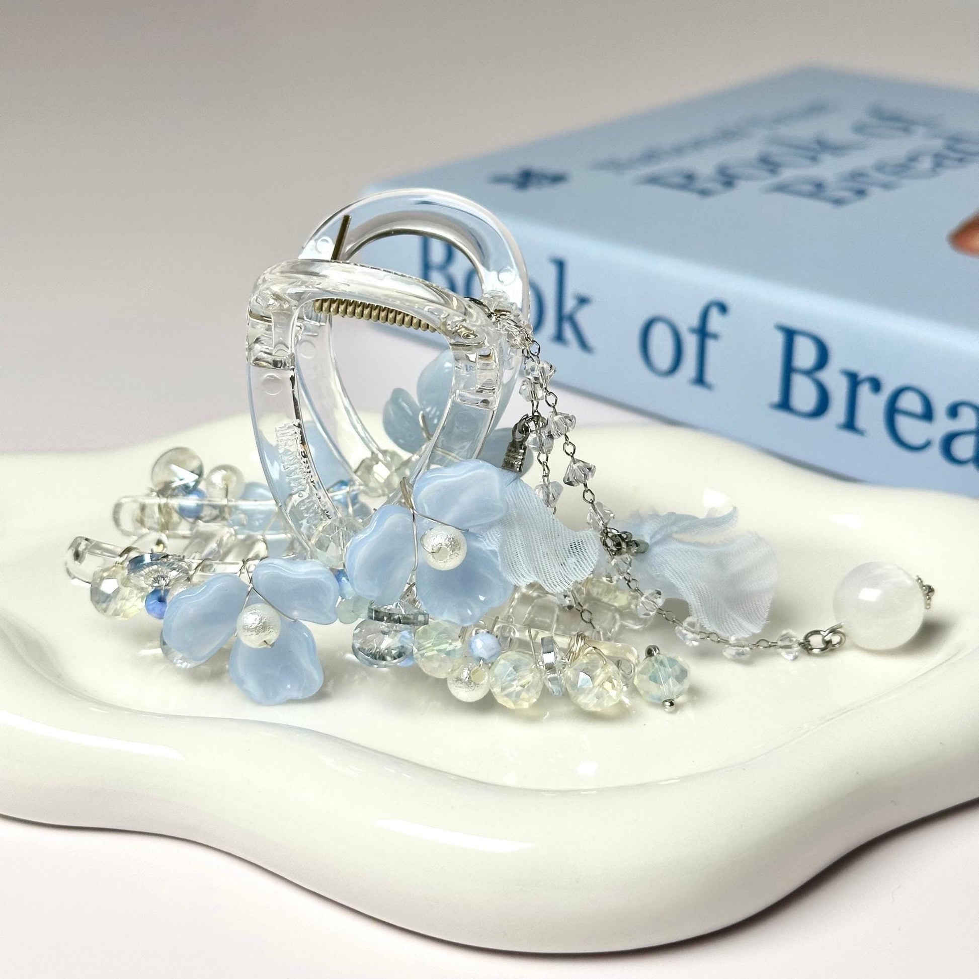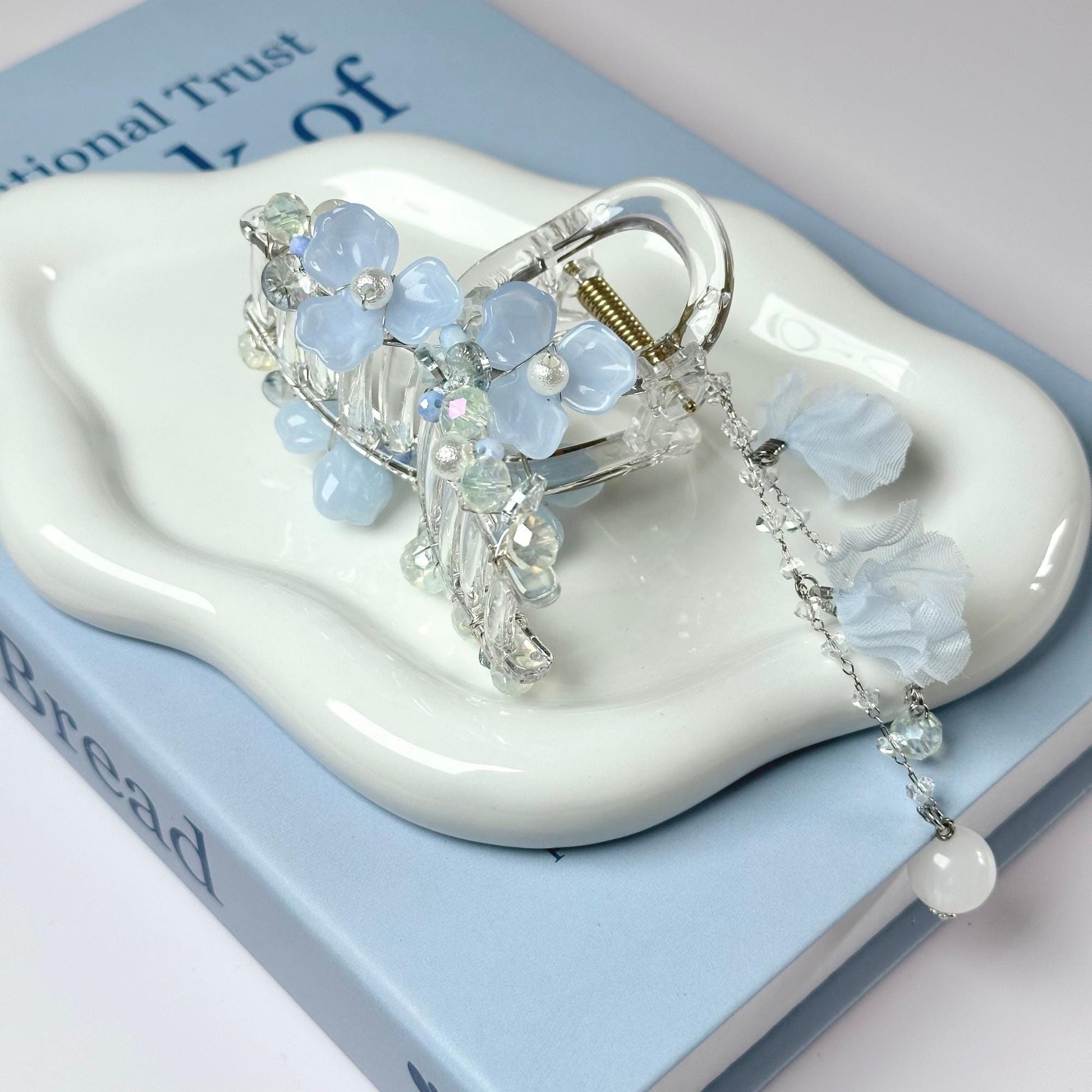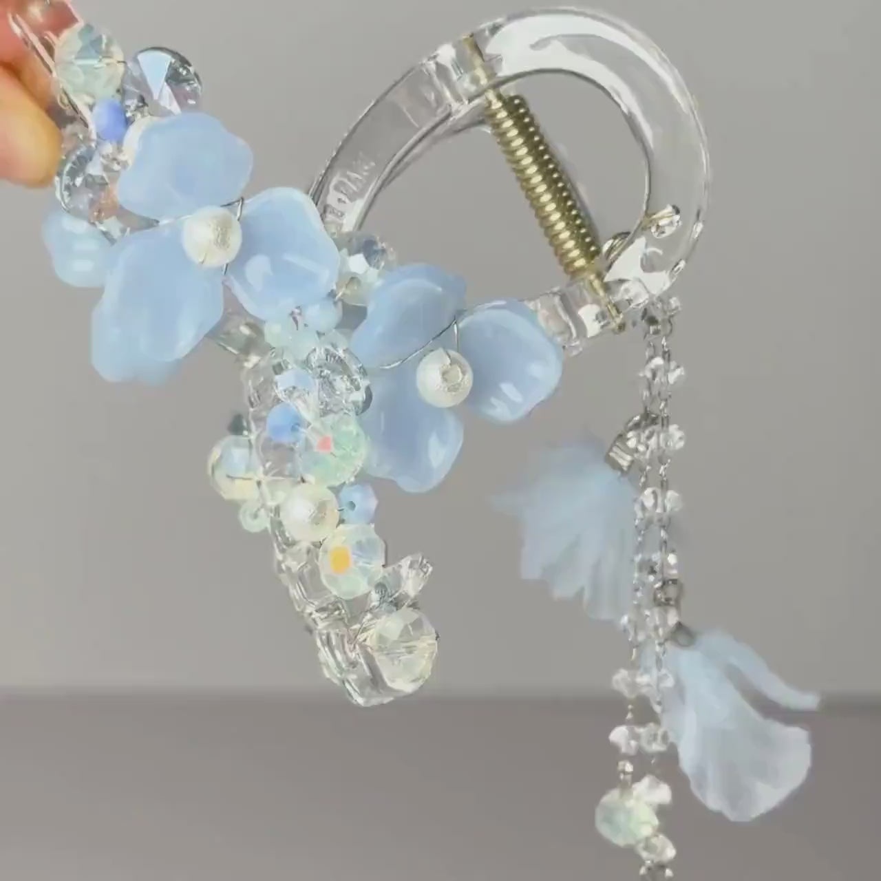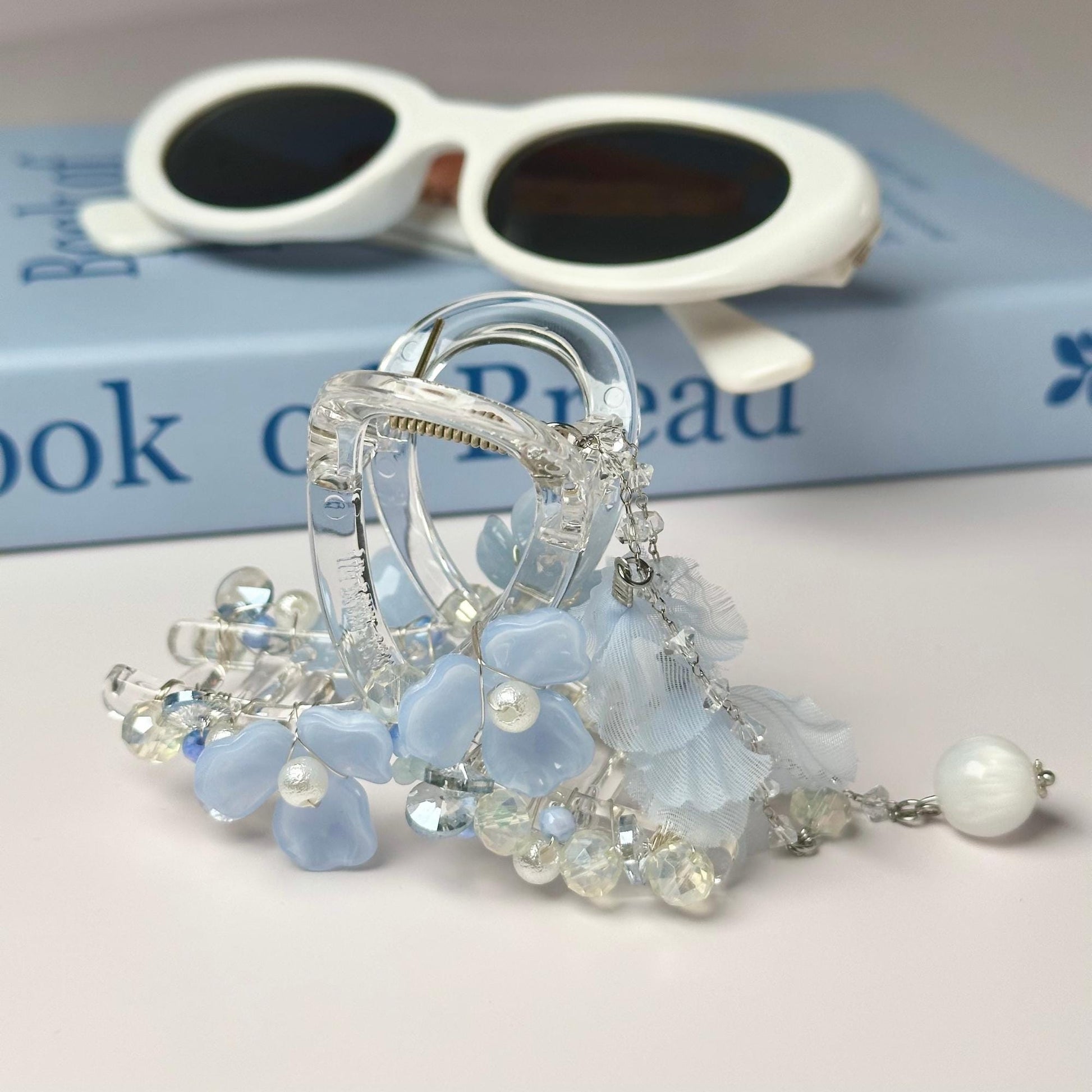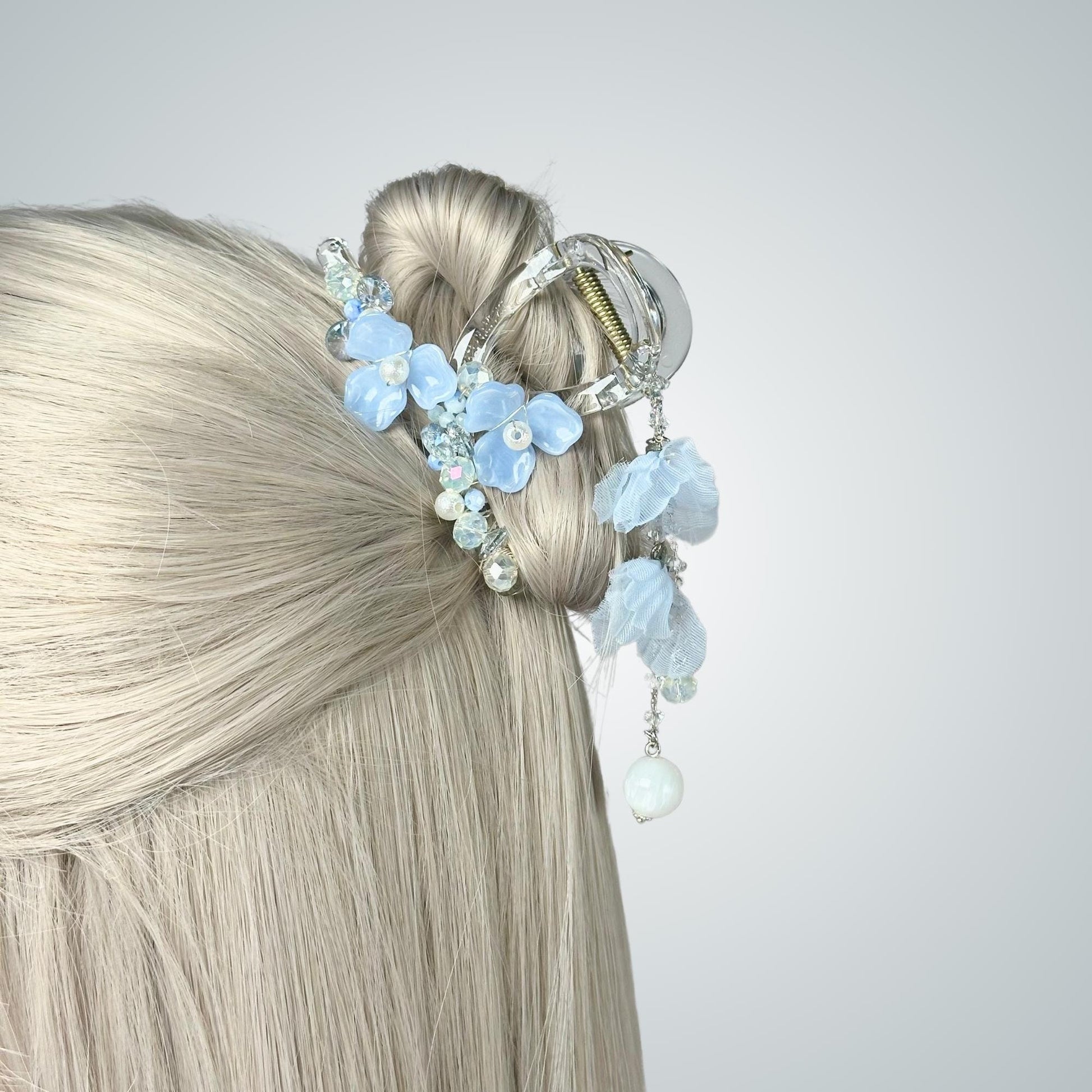 Hello! I'm Pepper. Thank you so much for stopping by my little handmade shop! For this piece, I wanted to capture the dreamy and ethereal feel of a cloud floating in a clear blue sky. I chose blue petals and translucent beads to create a light and airy effect, like tiny blossoms caught in a gentle breeze. The dangling pearls and crystals add a touch of sparkle, reminding me of morning dew reflecting sunlight. My hope is that when you wear this hair claw, it feels like carrying a piece of the sky with you, bringing a bit of magic to your day.
