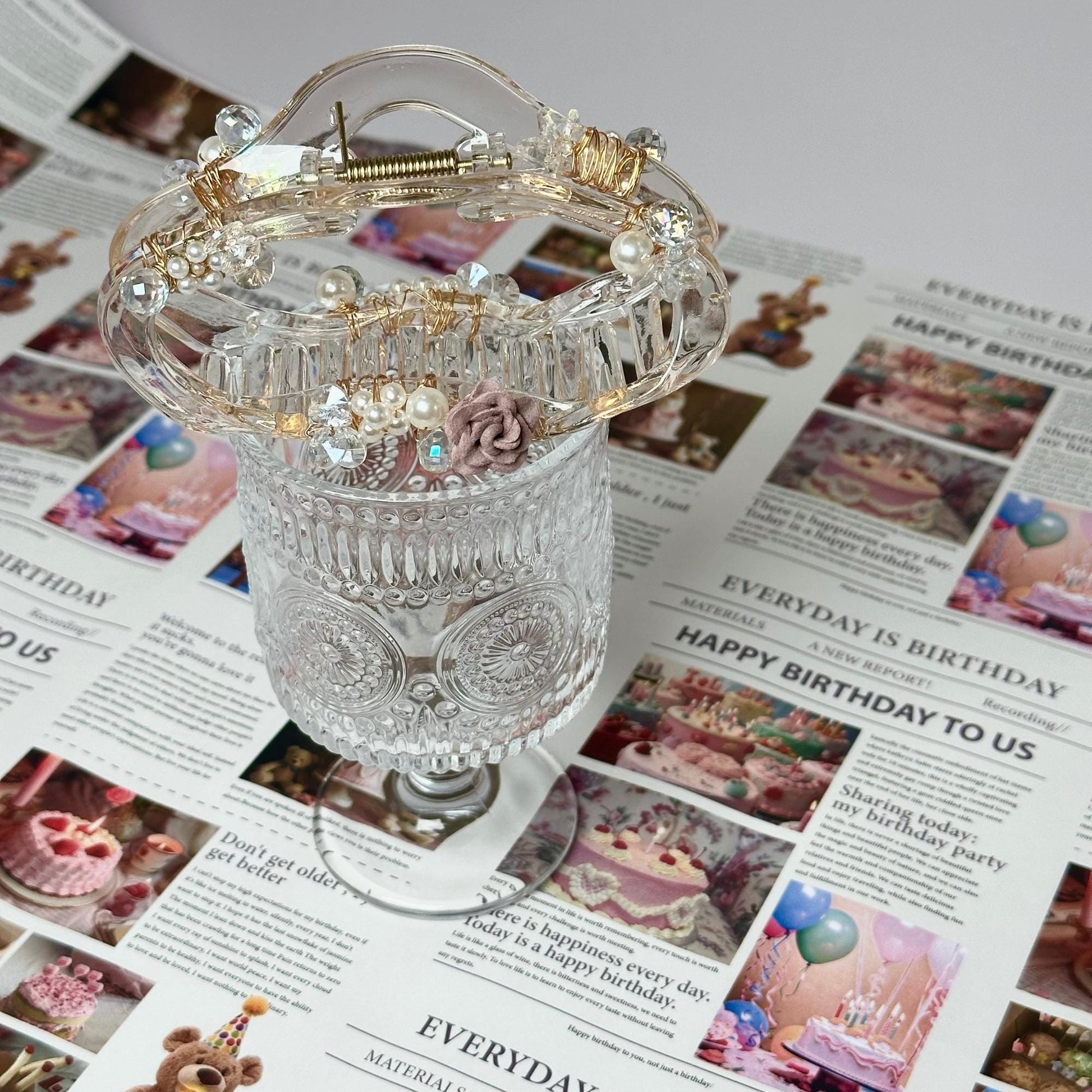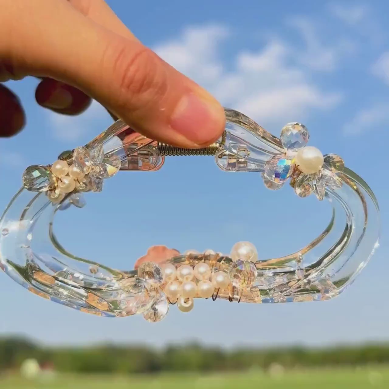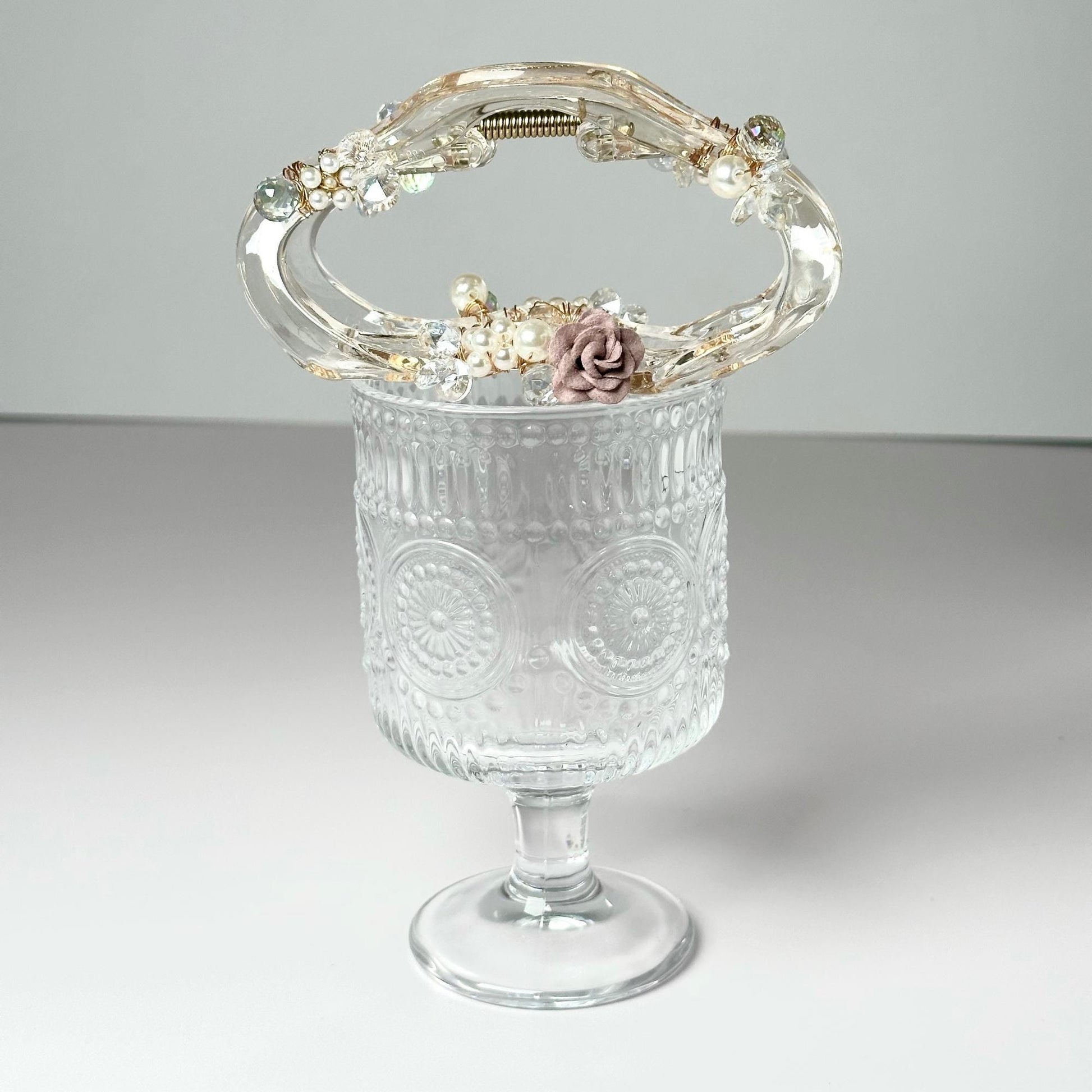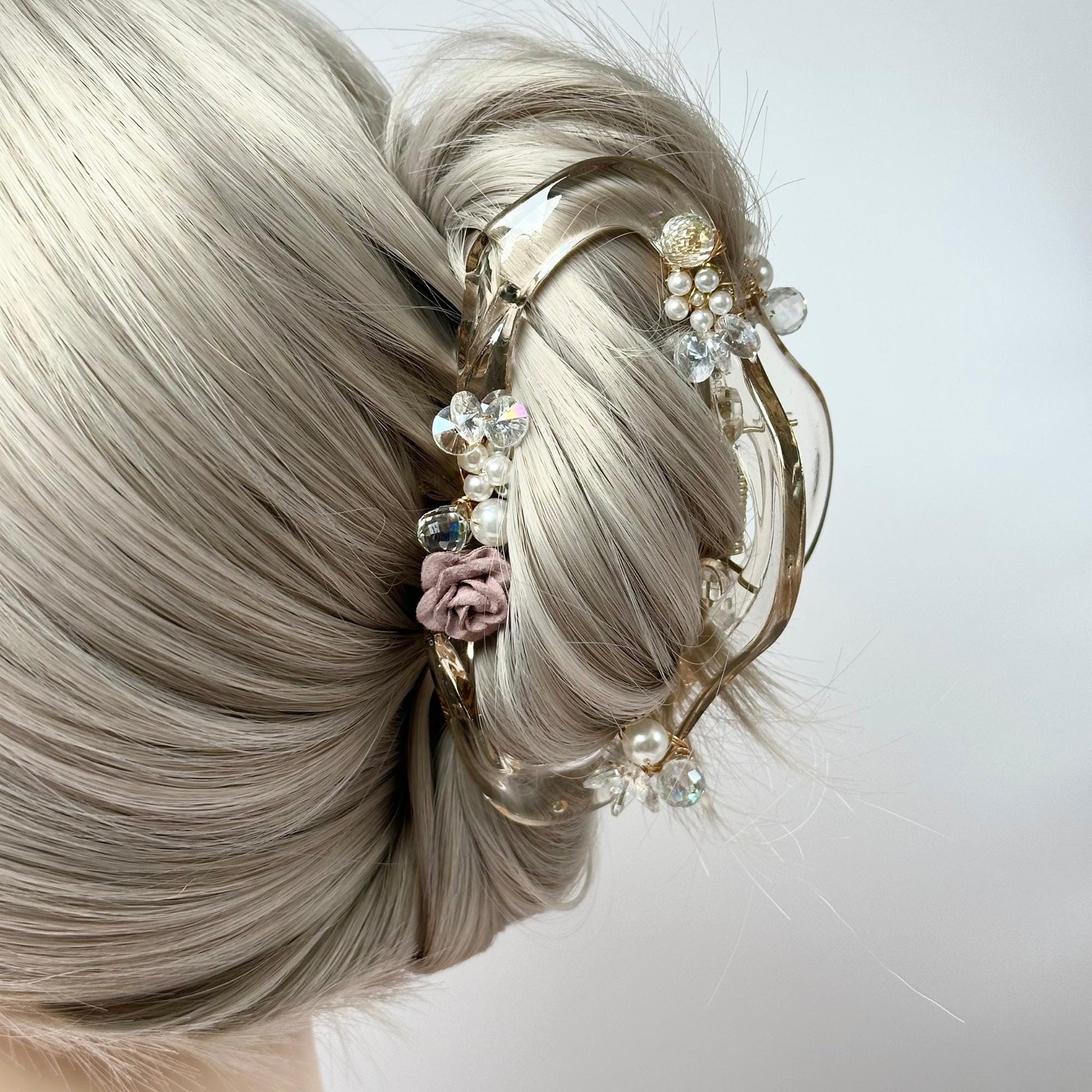 This hair claw is like a little bloom in your hair! I’ve added a soft blush rose with sparkling crystals and pearls to create a piece that feels both delicate and dreamy. With its clear base and gentle accents, it's the perfect blend of elegance and simplicity. I crafted this one to bring a touch of nature’s charm to your style
